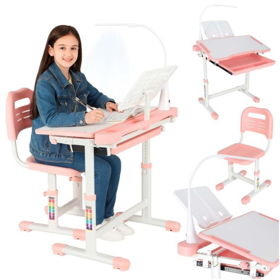 Biurko dziecięce szkolne regulowane krzesło lampka LED USB różowe