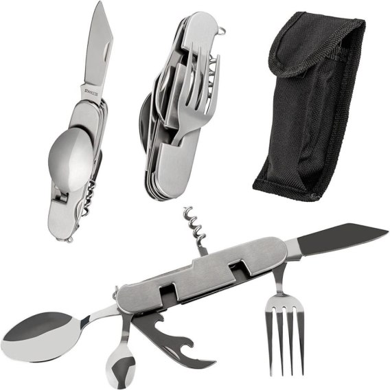 - posłuży jako nóż, otwieracz do butelek, korkociąg, łyżka, łyżeczka i widelec